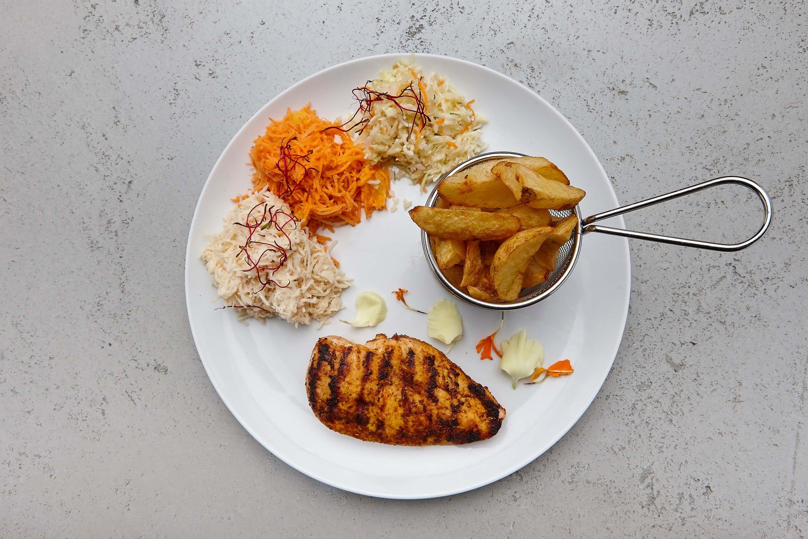 - Grillowana pierś z kurczaka, ziemniaczki opiekane, zestaw surówek