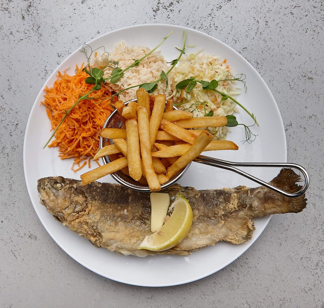 - Pstrąg smażony, frytki, zestaw surówek
