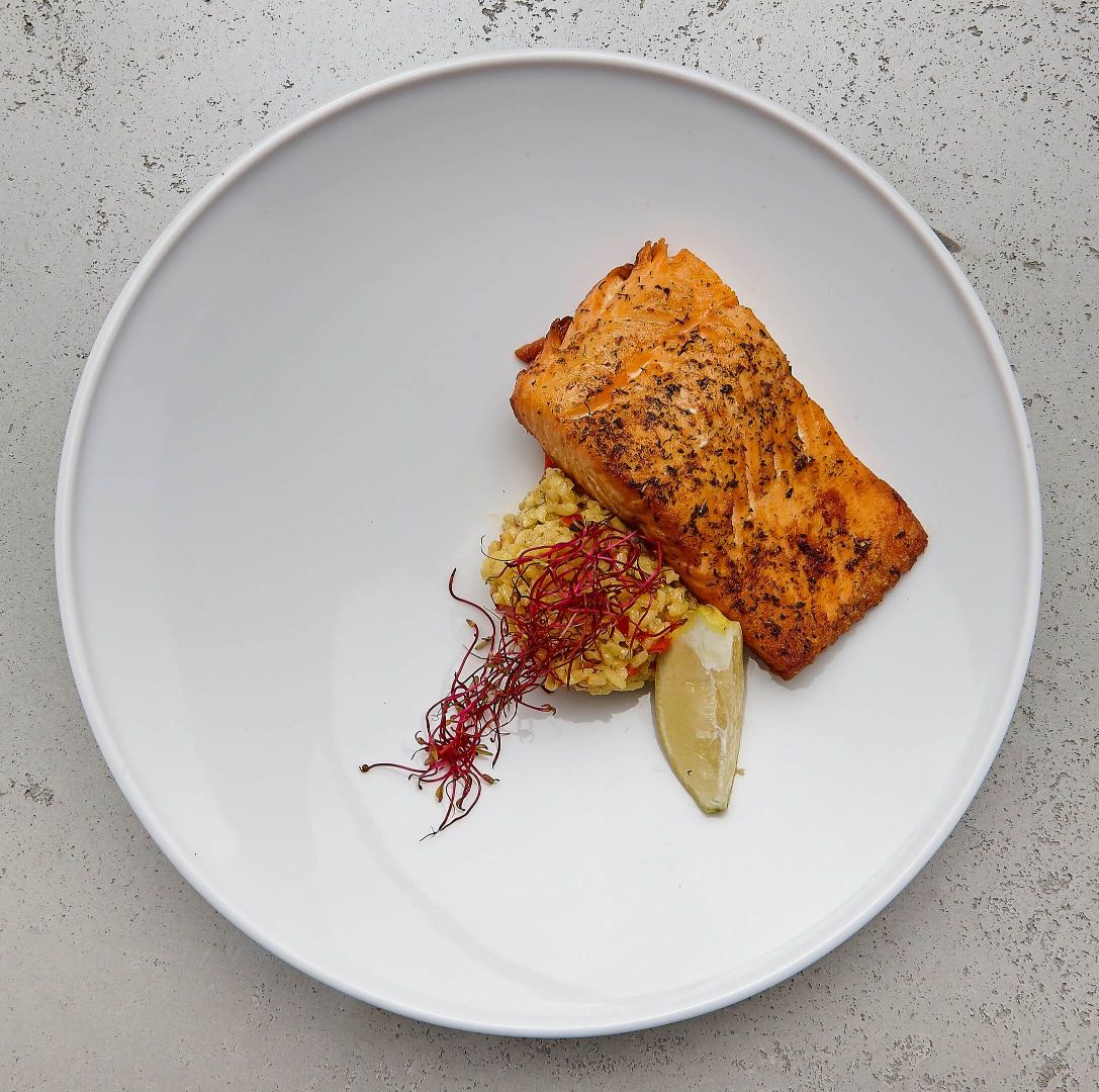 - Grillowany łosoś, risotto paprykowe