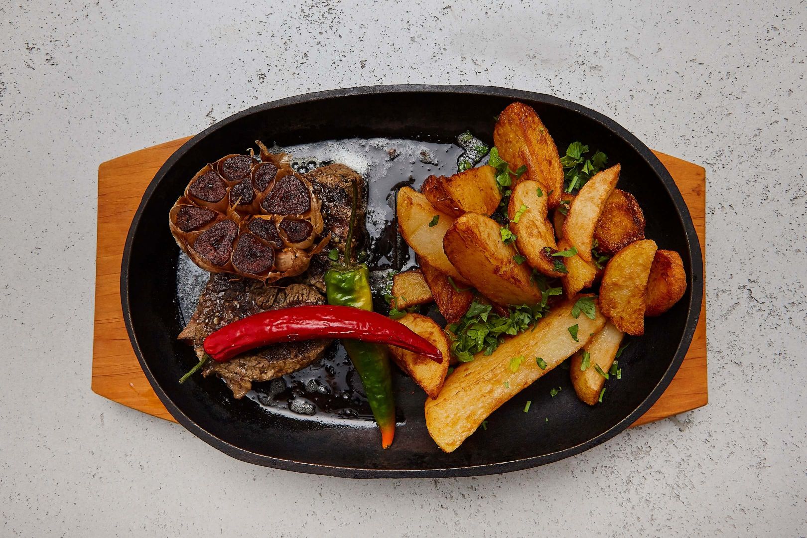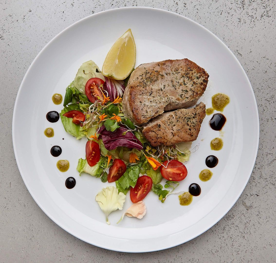 - Klasyczny stek z polędwicy wołowej z dodatkiem masła ziołowego, mix sałat, ziemniaczki stekowe
