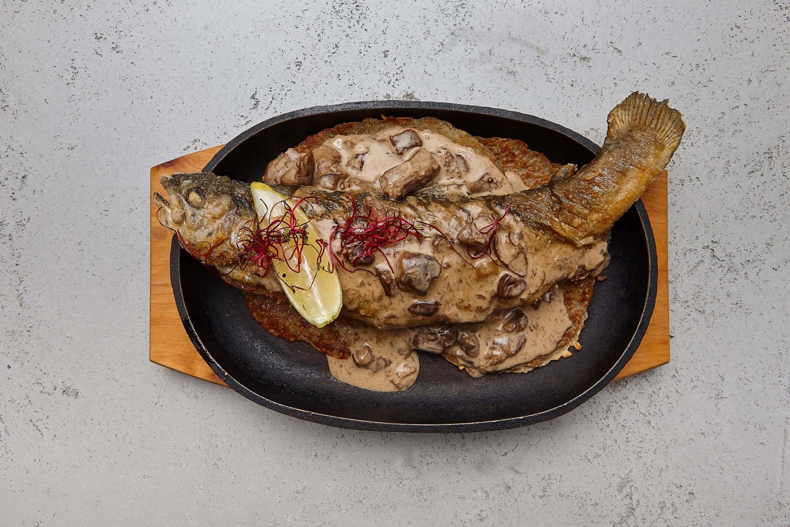 - Pstrąg w sosie borowikowym na plackach z blachy